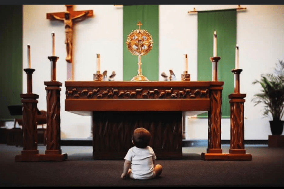 “It is easiest to tell what transubstantiation is by saying this: little children should be taught about it as early as possible. Not of course using the word “transubstantiation”, because it is not a little child’s word. But the thing can be taught, and it is best taught at mass at the consecration, the one part where a small child should be got to fix its attention on what is going on. I mean a child that is beginning to speak, one that understands enough language to be told and to tell you things that have happened and to follow a simple story. Such a child can be taught then by whispering to it such things as: “Look! Look what the priest is doing … He is saying Jesus’ words that change the bread into Jesus’ body. Now he’s lifting it up. Look! Now bow your head and say ‘My Lord and my God’,” and then “Look, now he’s taken hold of the cup. He’s saying the words that change the wine into Jesus’ blood. Look up at the cup. Now bow your head and say ‘We believe, we adore your precious blood, O Christ of God’.” [The cry of the Ethiopians at the consecration of the chalice.]. Thus by this sort of instruction the little child learns a great deal of the faith. And it learns in the best possible way: as part of an action; as concerning something going on before it; as actually unifying and connecting beliefs, which is clearer and more vivifying than being taught only later, in a classroom perhaps, that we have all these beliefs.”