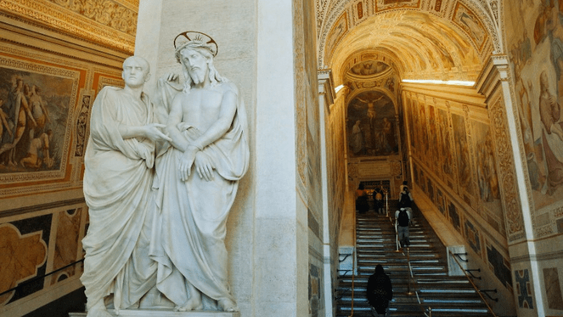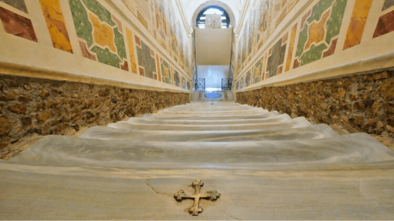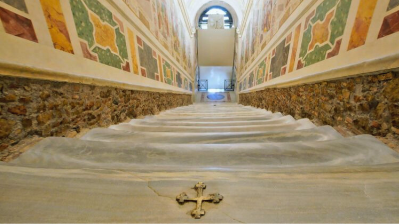 The Holy Stairs are the stairs Jesus climbed on his way to His trial at the praetorium of Pilate during His Passion. The building is called the Pontifical Sanctuary of the Holy Stairs (Pontificio Santuario della Scala Santa), and includes part of the old Papal Lateran Palace. In 326 AD the staircase was transported from Jerusalem to Rome at the request of Saint Helena, mother of Emperor Constantine.