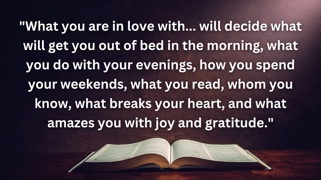 “What you are in love with… will decide what will get you out of bed in the morning, what you do with your evenings, how you spend your weekends, what you read, whom you know, what breaks your heart, and what amazes you with joy and gratitude.”