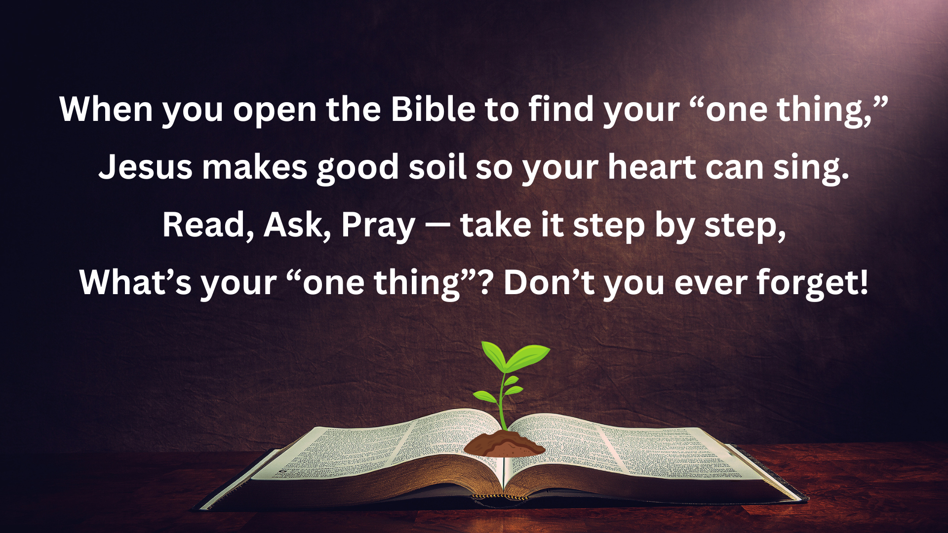 When you open the Bible to find your “one thing” – which is simply a sentence or word in the passage you’re reading that somehow speaks to you personally in some way.