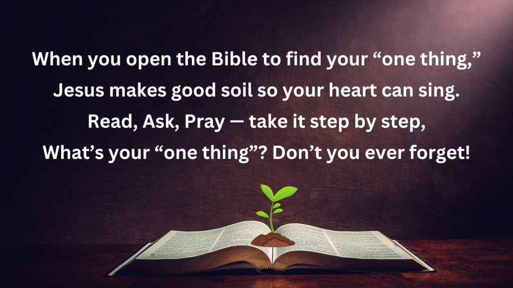 As I was praying for you all, Jesus showed me how today’s reading can all be summarized in “one thing”, which happens to be my all-time favourite verse from the Bible.