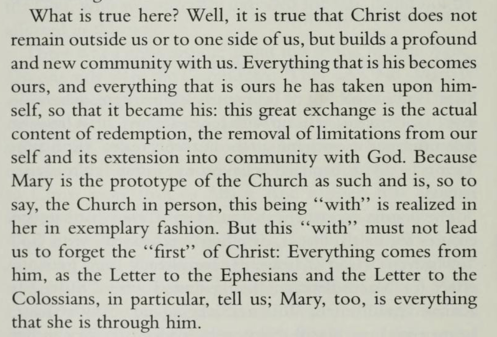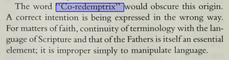 Pope Benedict XVI, as Cardinal Ratzinger criticized the title, stating that it is prone to misunderstanding because it departs too far from the language of Scripture and Church Fathers, concluding: “For matters of faith, continuity of terminology with the language of Scripture and that of the Fathers is itself an essential element; it is improper simply to manipulate language.” Furthermore, he argued that the title’s intended meaning is better conveyed in existing Marian titles, as they do not obscure the reality of Christ’s redemption.