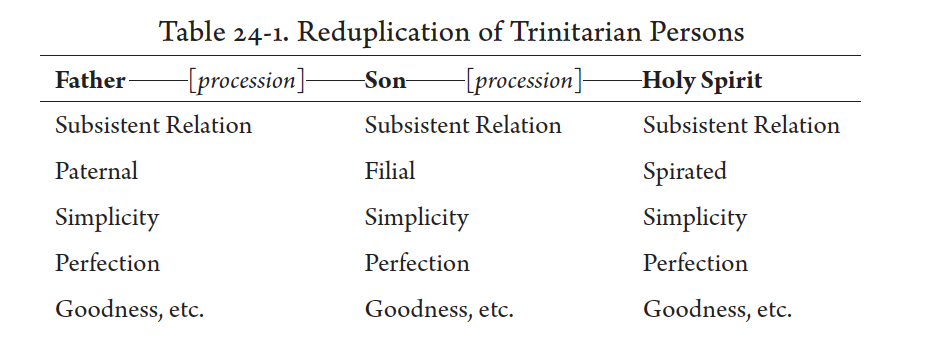 As table 24-1 helps show, we can think of a divine person (under a twofold aspect): first in relational terms, second in essential terms.
